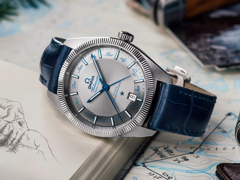 Omega Constellation Globemaster Co-Axial Master Chronometer Annual Calendar Watch - 41 mm Steel Case - Fluted Bezel - Grey Dial - Blue Leather Strap - 130.33.41.22.06.001
