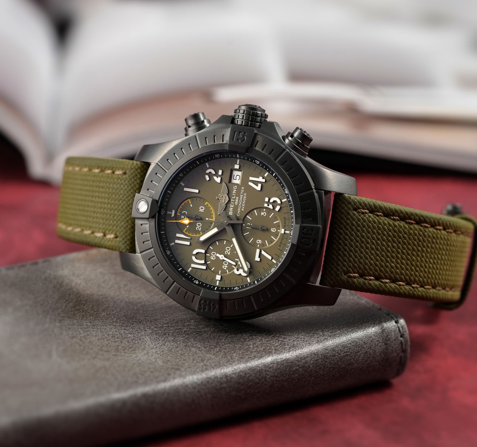 Breitling Avenger Chronograph 45 Night Mission Watch - DLC-Coated Titanium - Green Dial - Khaki Green Calfskin Leather Strap - Tang Buckle - V13317101L1X1