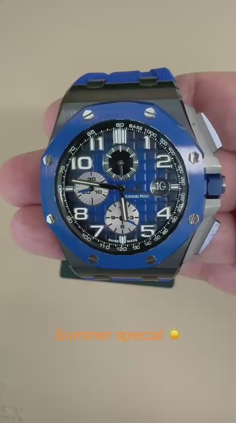 Powered by the Audemars Piguet Calibre 3126/3840 automatic chronograph movement, this reference offers a 50-hour power reserve and reliable precision. The chronograph subdials, applied hour markers, and date display at 3 o’clock combine practicality with design sophistication. With 100 meters of water resistance and the robust construction typical of the Offshore line, this model balances performance, durability, and visual impact for a standout presence on the wrist.